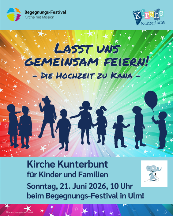 Wir laden euch herzlich ein, in der Kirche Kunterbunt mit uns die Geschichte der Hochzeit zu Kana zu erleben. Mit Eurer ganzen Familie entdecken wir, was zu einem guten Fest dazugehört und wie Feste in unterschiedlichen Kulturen gefeiert werden - lasst Euch einladen!
